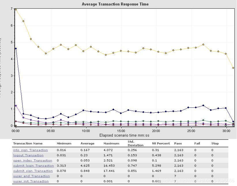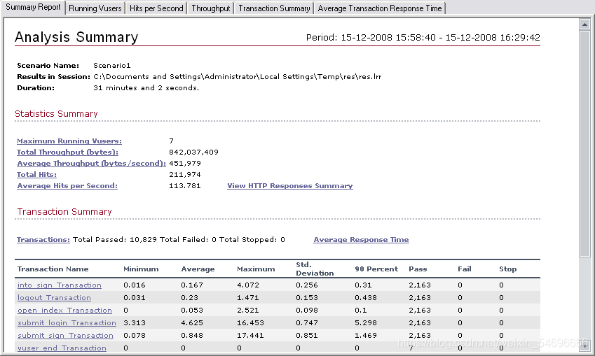 从图中可以看出,所有的Aciton都是绿色的,即表示为Passed,同时除了vuser_init与vuser_end两个事务,其他的事务通过数为2163,也就表明在30分钟的时间里,共完成了2163次登录考勤业务操作。那么根据这些可以判断本次测试登录业务与考勤业务的成功率是100%,再次更新测试结果记录表如下表所示。