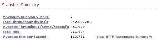 从该图我们得知,本次测试运行的最大并发数为7,总吞吐量为842,037,409字节,平均每秒的吞吐量为451,979字节,总的请求数为211,974,平均每秒的请求为113.781,对于吞吐量,单位时间内吞吐量越大,说明服务器的处理能越好,而请求数仅表示客户端向服务器发出的请求数,与吞吐量一般是成正比关系。