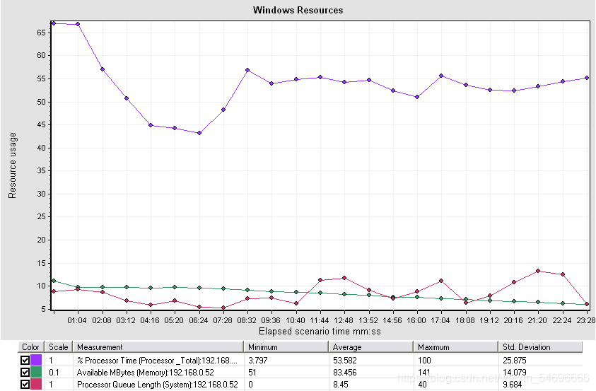 根据Windwos资源性能指标的解释,一般情况下,如果“Processor Queue Length(处理器队列长度)”一直超过二,则可能表示处理器堵塞,我们这里监控出来的数值是8.45,而且总体上保持平衡,那么由此推断,测试服务器的CPU也可能是个瓶颈。同时在测试过程中,场景执行到23分半钟的时候,报出了错误!未找到引用源。的错误,意思是说被监控的服务器当前无法再进行计数器数据的获取了,所以,本次操作系统资源的监控只得到了场景执行的前23分半钟的数据。这样对本次测试结果有一定的影响。