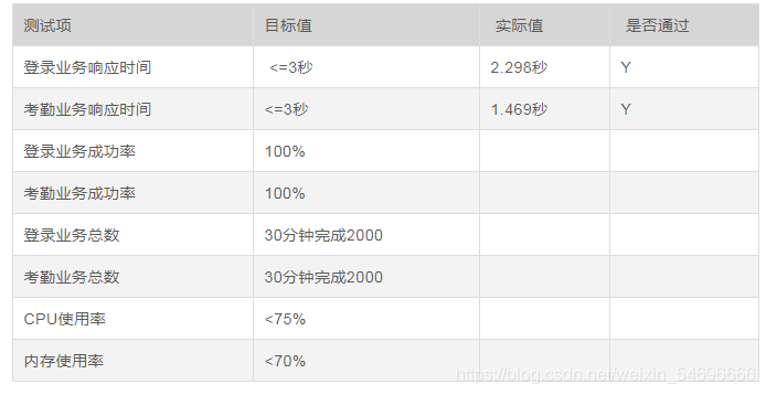 获得上述数据后,最新的测试结果记录表如下表所示。 从上表数据来看,本次测试总体上已经达到了预期的性能指标,但从其他的数据,比如CPU的队列长度、内存使用率来看,被测服务器的硬件资源需要提升。