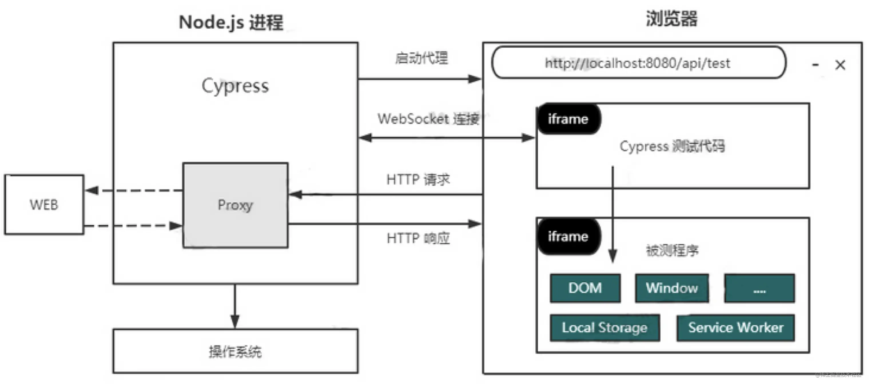 技术上讲,cypress通过webpack将测试代码打包成一个bundle,放到一个iframe中运行,当首次加载cypress时,cypress web应用程序先把自己托管在本地的一个随机端口上,在识别出第一个cy.visit()命令后,cypress会更改本地URL以匹配你远程应用程序的origin(满足同源策略--即相同域名、协议、端口),使得测试代码和应用程序在同一个run loop中运行。