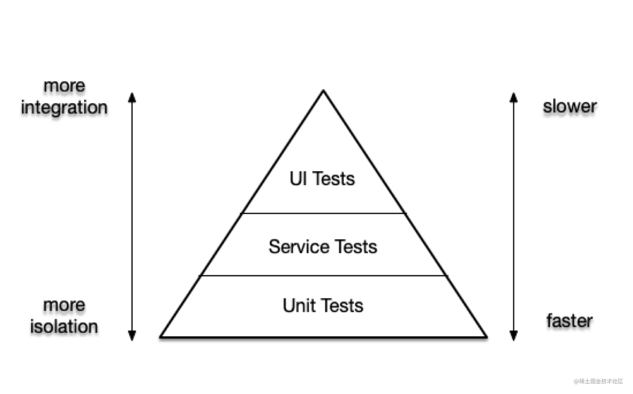 整个金字塔模型代表着越上层的测试集成度越高,执行速度越慢,越下层的测试隔离性越好,执行越快越轻量。