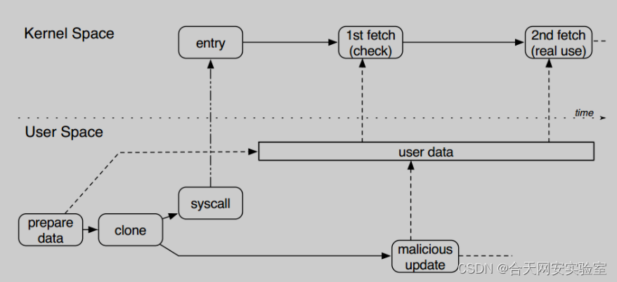 二、Double Fetch介绍如下图所示,用户态首先准备好用户态数据(prepare data),然后执行syscall进入内核态后,会对用户态数据进行第一次fetch,这一次fetch主要是做一些检测工作(如缓冲区大小、指针是否可用等),在检查通过后会执行第二次fetch对数据进行实际操作。而在这期间是存在一定的时间差,如果我们在用户态数据通过第一次check以后创建一个恶意进程利用二次fetch之间的时间差修改掉原先用户态的数据,那么在内核执行第二次fetch时处理的就并非原先通过检测的数据,而是我们精心准备的恶意数据,而此类漏洞往往会引起访问越界,缓冲区溢出最终造成恶意提权的情况。