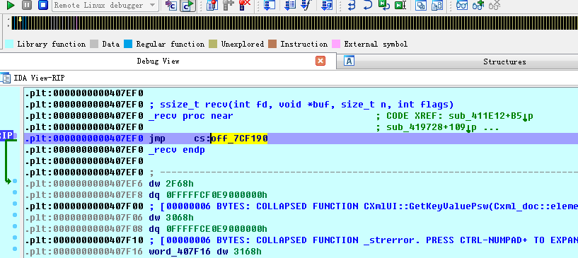 可以看到程序暂停在_recv函数处,让程序执行到返回(快捷键Ctrl+F7),可以看到程序调用_recv函数的代码段