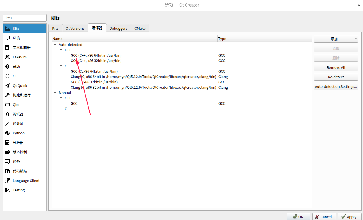重新打开qt以后,自动侦测可以看到自行配置g++了