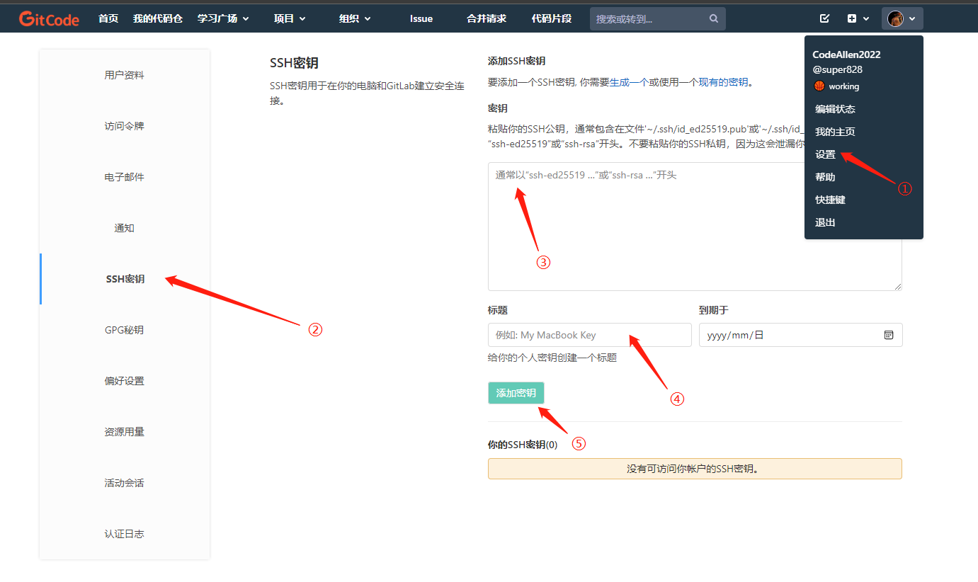复制上述文本后,进入你的Gitcode配置界面,按照①②的顺序将文本粘贴到③内