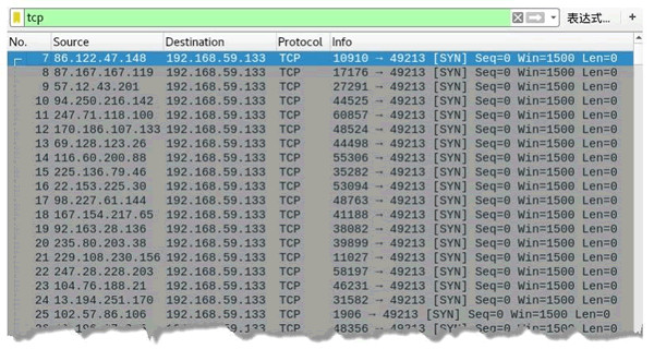 其中,所有的数据包目标 IP 地址都为 192.168.59.133,源 IP 地址为随机的 IP 地址,源端口为随机端口,目标端口为 49213。这些数据包就是探测时发送的 TCP[SYN] 包。 5) 目标主机的防火墙规则可能限制了特定 IP 地址的主机进行连接。那么,在进行探测时,其他 IP 地址的 TCP[SYN] 包会得到对应的 [SYN,ACK] 响应包,被限制的 IP 地址主机将不会收到响应包。捕获到的探测数据包,如图所示。