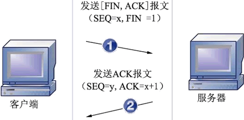 当服务器端收到客户端发来的断开 TCP 连接的请求后,回复发送 ACK 报文,表示已经收到断开请求。回复时,随机生成一个序列号 SEQ=y。由于回复的是客户端发来的请求,所以在客户端请求序列号 SEQ=x的基础上加 1,得到 ACK=x+1,如图所示。