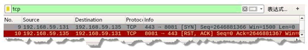 图中,第 13 个数据包源 IP 地址为 192.168.59.131,目标 IP 地址为 192.168.59.135。 在 Transmission Control Protocol 中可以看到 Flags 为(SYN),并且 SYN 的值被设置为 1,说明该数据包为成功构造的第 1 次握手包。 第 14 个数据包为主机 B 返回的 [SYN,ACK] 响应包。 3) 如果构造的握手包连接主机 B 未开放的端口,将不会收到对应的 [SYN,ACK] 响应包。例如,连接端口 8081,捕获数据包如图所示。