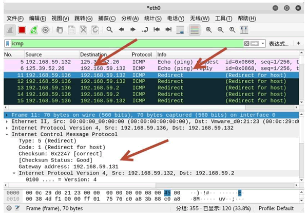 第 13 帧的源 IP 地址为 192.168.59.136(设置的源 IP 地址),目标 IP 地址为 192.168.59.2(目标主机 A 的网关)。该数据包也是一个重定向的数据包。 在 Internet Control Message Protocol 部分中,Gateway address:192.168.59.131 表示目标主机 A 的网关被修改为了 192.168.59.131。