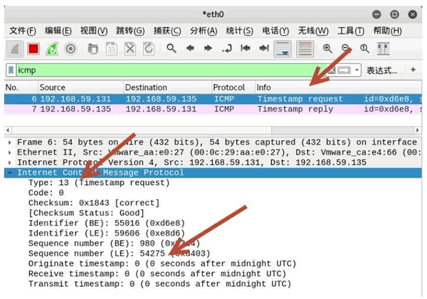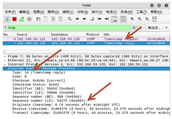 其中,第 6 个数据包为 ICMP 时间戳请求。 在 Internet Control Message Protocol 部分中,Type 值为 13,Code 值为 0,表示该数据包为 ICMP 时间戳请求。 Originate timestamp 的值表示数据包发起的起始时间,这里为 0 秒(午夜 0 点 0 秒);Receive timestamp 的值表示接收数据包的时间,这里为 0 秒;Transmit timestamp 的值表示数据包的发送时间,这里为 0 秒。时间为 0 秒,是因为从午夜零点开始计算。 3) 选择对应的响应包查看信息,如图所示。