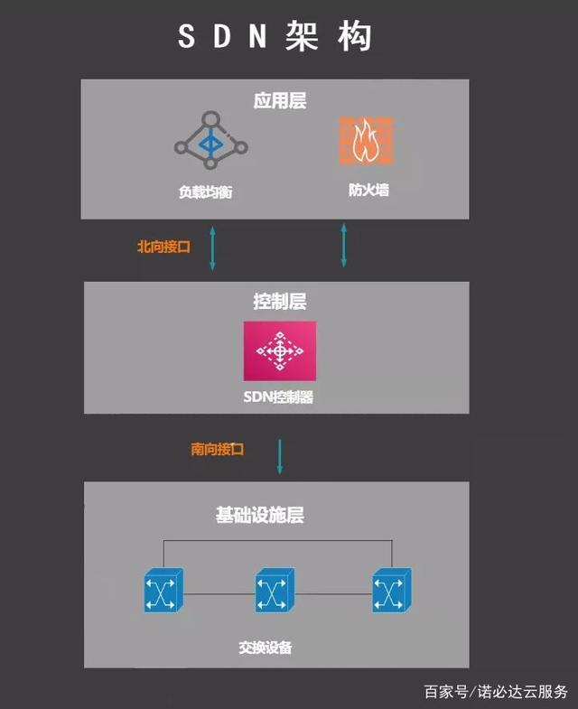 API接口这三层使用各自的北向和南向API 进行通信,应用程序通过其北向接口与控制器通信,尽管存在其他协议,但控制器和交换机使用南向接口(例如OpenFlow)进行通信。