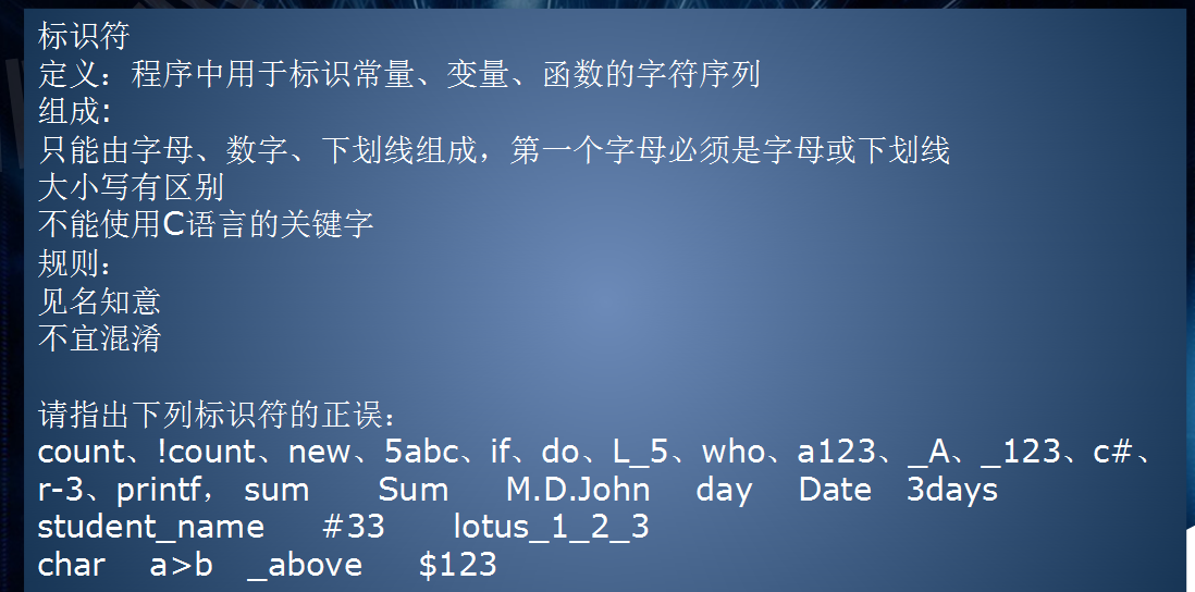 3.2.3.4 请指出下列标识符的正误: count、!count、new、5abc、if、do、L_5、who、a123、_A、_123、c#、r-3、printf, sum Sum M.D.John day Date 3days
