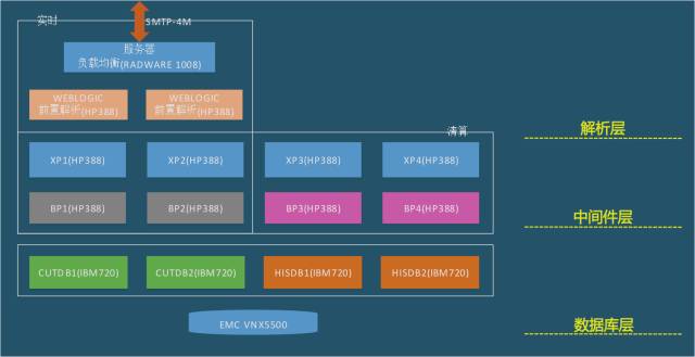 下面介绍一下一期的架构,很明显看到就是传统的 IOE 架构。底层存储是 EMC 存储。中间层就是采用小型机,其中 KCXP 和 KCBP 是金证公司的消息中间件和业务中间件。往上前端是前置解析是用的 WebLogic,负载均衡用的硬件负载均衡。