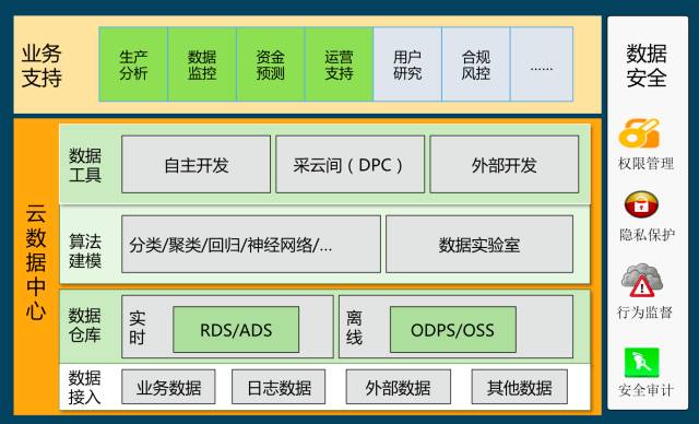 近一年来很多工作都是考虑数据后处理这块。其中数据来源于业务数据、日志数据和其他数据。我们推进数据仓库的建设和数据的产出。工具方面我们有很多自主开发的,同时也采用了阿里采云间,以及其他外采工具,具体支撑业务包括生产数据分析、资金预测、数据监控、运营支持,合规风控支持等等。开篇也提到了金融系统数据安全是重中之重,所以这块我们也会有相关的数据安全方面的管理。
