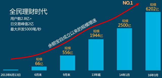 可以说从余额宝开始,真正的进入一个全民理财的时代,接下来给大家分享一下几个数字。余额宝用户数可以说达到了接近于 1/4 国人数量,日交易峰值可以达到两亿笔,最大并发数可以达到每秒五千笔。截止 2016 年上一季度公开披露信息,规模已经达到六千亿以上。