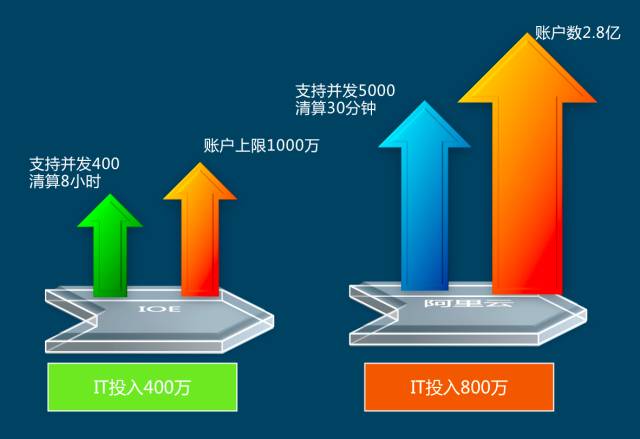 这是上云前后投入产出对比情况,传统的 IOE 架构特点成本很高,硬件成本给企业带来的压力非常大,云计算的好处就是在成本上是可以做到很细的,并且方便按需增加,这是一个非常大的成本上的优势。过去投入四百万只能支持一千万的帐户的量级,现在在投入上可能只是增长一倍,支持用户数已经远远不止一倍了。