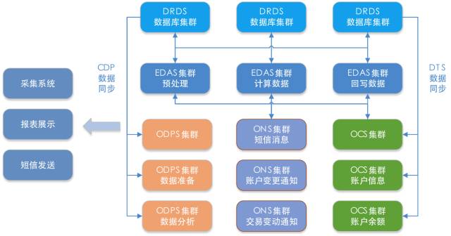 下面是一个总图,中间 EDAS 是统一企业级服务化解决方案,然后通过 DTS 解决数据实时同步的问题,采用 CDP 解决离线数据同步的问题。在数据应用上可以满足很多的需求,比如采集系统或者报表展示或者是用户短信的推送等等,这就是我们对整个未来的架构演进的思考。