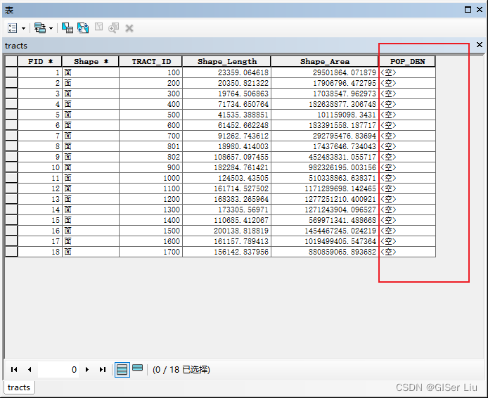 当我们需要的要素属性值位于多个不同的属性表时,我们可以使用属性表的连接功能将不同的属性表根据相同字段的值连接到同一个表格中;因为 人口密度=区域人口数量/区域面积。我们需要将区域人口数量字段和区域面积字段连接到tracts属性表中用于后续计算。打开tracts属性表,我们可以看到shape_Area字段,它表示区域面积;打开tracts_pop属性表,我们可以看到POPULATION字段,它表示区域人口数量。属性表连接接要求两个属性表拥有至少一个相同字段,观察两个表格,我们可以发现他们都拥有TRACT_ID字段,表示区域编号;我们可以利用这个字段对两个属性表连接,进行相同字段匹配。
