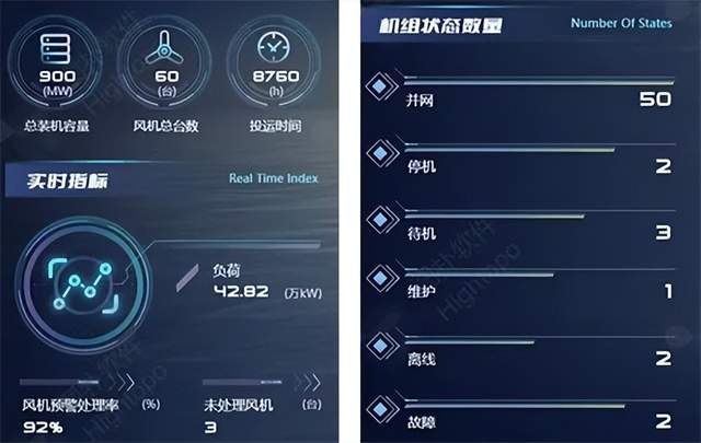 图扑软件 HT 基于风电场的数字化建模,多维度实时监测风机运行状态,负荷参数,实现预防性维护。通过 2D、3D 无缝融合的面板展示风机工作信息实时指标与机组状态数量,包括负荷、风机预警处理率、未处理风机等。以及并网、停机、待机、维护、离线、故障风机数量。依托数据中心建设远程故障预警诊断能力,实现智慧运维服务,提升效益。