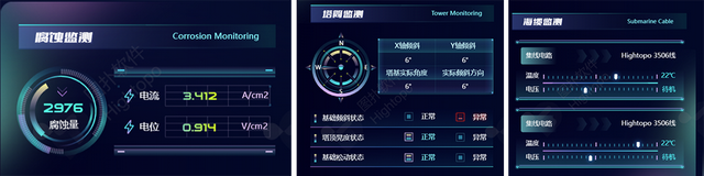 传统的腐蚀监测主要是在停车检修期间安装和取出挂片进行检测,需破坏材料的结构,试验时间长,而且得到的结果往往是整个试验周期中产生腐蚀的总和,不适于现场使用。图扑软件通过对接腐蚀传感器以及环境多因素传感器,展示设备安装点的腐蚀电流、电位、腐蚀量等参数,从而有效表征环境腐蚀性,为海上风电的腐蚀原因及制定相对应的防腐蚀措施提供了科学依据。