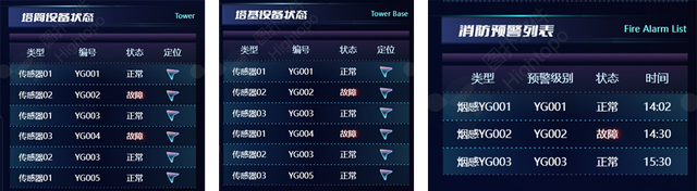 每一种传感器根据实际安装位置分布在机舱内,每个点位的传感器状态都具有相应的展示效果。鼠标左键点击传感器点位,弹出实时的状态信息面板。包含烟感探测器、气体启停按钮、热气溶胶灭火器等。通过多维度的数据监测,为智能风机的管理和控制提供准确有效的数据输入。右侧 2D 面板包含风机温度、电流以及机舱设备状态基本信息列表,实时监测风机的健康状态。