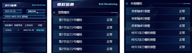 螺栓监测塔筒螺栓和叶根螺栓在线监测模块可以实时监测风机关键位置连接螺栓的紧固状态、反旋松动、螺栓预紧力偏差等数据,有效保障机组的安全稳定运行。
