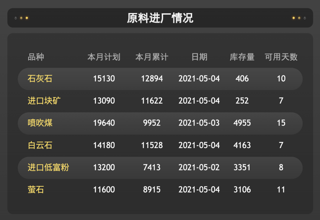 同时驾驶舱中对原料压港、进厂、费用等关键信息辅以 2D 组态面板呈现,并提供时间维度切换功能,纵观数据发展。