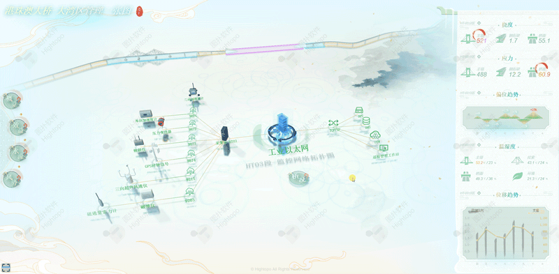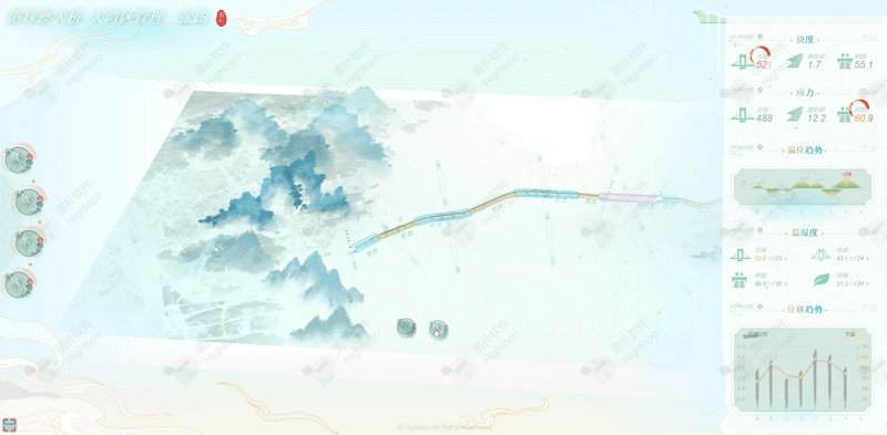 Hightopo 通过可视化技术,整合数据资源,实现大湾区数据共享,共同合作,互惠互利,形成合作紧密、共创共享的数据应用中心。通过可视化手段,涵盖大桥建设细节与营运过程管理业务,以运营管理为主线,通过效益、大桥基本信息等数据关联的综合控制和管理,从而实现了多业务、多流程、多信息的集成管理。