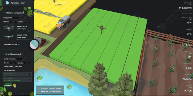 农机管理可视化搭载北斗导航定位系统、5G 通信系统、机具状态检测传感技术,可对“无人收割机”、“无人拖拉机”、“无人采摘机”等多类型农机,进行高精准地理定位、路径自动规划、故障自动检测。结合 HT 引擎强大的渲染技术,精准复现农机在各地块的作业动态。远程操作农机的启停,根据事先规划好的路径,进行瓜果粮蔬自动采摘收割工程。设有车辆抓拍、移动侦测、入侵报警等智能分析功能,对作业现场、农机轨迹动态监控预警。2D 面板图表则呈现各农机的重要运行参数、收割数据详情、历史数据曲线对比等信息。