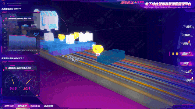 Hightopo 采用轻量化三维建模技术,高仿真模拟综合管廊内部场景,以 3D 场景为基础,2D 数据面板为辅,数字化展现城市地下隧道空间,了解电力、通信,燃气、供热、给排水等各种工程管线的铺设情况,并在图扑可视化大屏进行检修口、吊装口和监测系统的查看地下综合管廊智慧管理 Web 平台利用三维可视化和虚拟仿真技术,对地下综合管廊的物理要素和信息系统进行高精度模拟重现,围绕感知、传输、数据、平台与应用以及展现等层面的关键技术研究及其应用,实现城市地下综合管廊安全运营与智慧管控。
