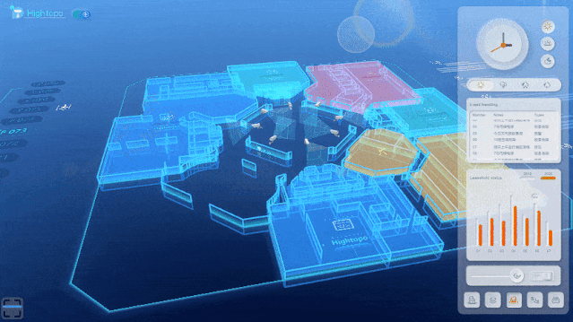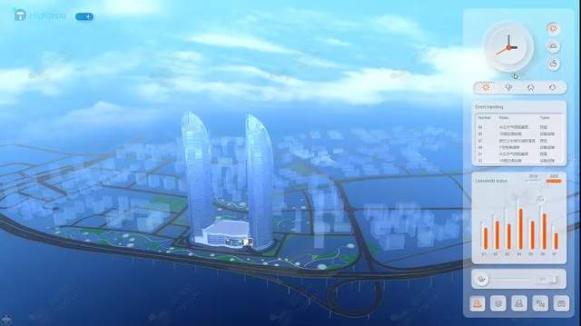 智能楼宇三维可视化系统,通过对楼宇的数字化高仿真场景中所有子系统的运行数据进行可视化展示。并提取运行数据进行设备运转、资产管理等重点业务的趋势分析。