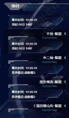 比赛中触发的事件都会在列表中滚动更新,记录赛事中关键节点,可以从列表中看到选手解题用时, 或者超出限定时间的淘汰广播,以及随机触发的附加题等特殊事件。