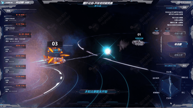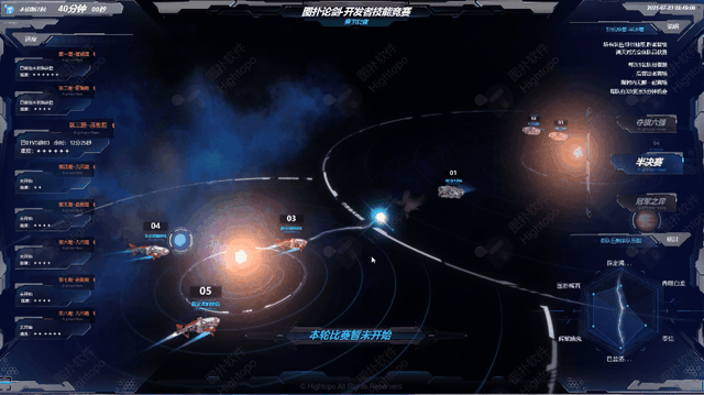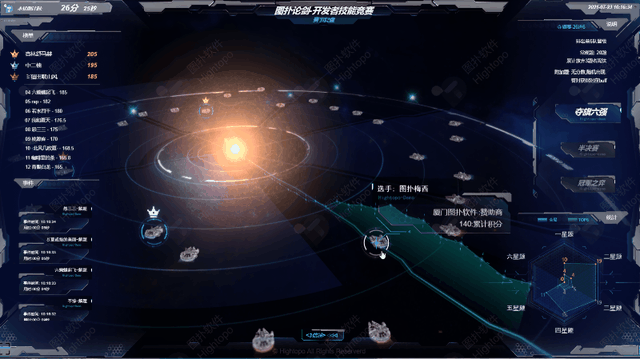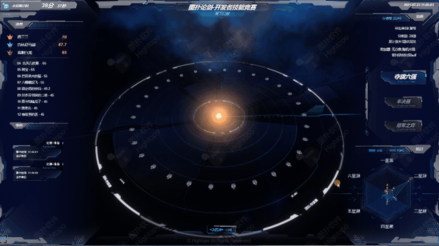 使用 HT 的 2D、3D 引擎,经过搭建场景、搭配数据面板以及动画驱动来制作,整体以科幻星球风格为主调,场景以太阳系环绕的视角展开,以太阳为中心,并增加光晕渲染效果,根据赛事数据四周环绕天体作为选手、赛题等信息。两边面板呈现比赛进行的各项信息。场景支持常规的旋转、平移和视角缩放。