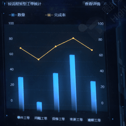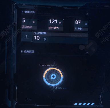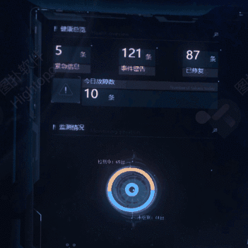 界面两侧的数据面板分为两部分,左边以告警信息为主,右边则以统计信息为主。以图表、圆盘、柱状图等多种方式对数据进行统计,可以让管理者对资产状态一目了然,便于管控工作。