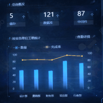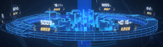 界面中间是一个非常酷炫的三层转盘,每一层代表的是不同组织架构内资产统计情况,同时中间的圆柱上还有二进制代码进行装饰,与围绕在转盘周围的科技环一起,为整个界面营造出前卫的科幻感。