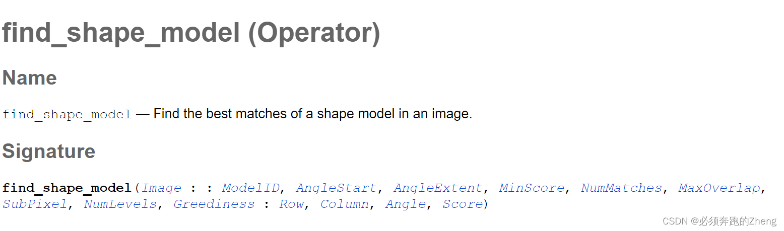 第一个参数是输入图像,第二个参数是模板,这个模板就是create_shape_model中的最后一个输出参数;第三个参数和第四个参数和create_shape_model中的角度一样;第五个参数是最小分数,也就是匹配ModelID的时候我们判定当前找到的基准和我们创建的基准的相似度,相似度越高,找到的难度也就越大,相似度越低,找到错误的几率也就越大,所以一般这个值我们设为0.5到0.8;