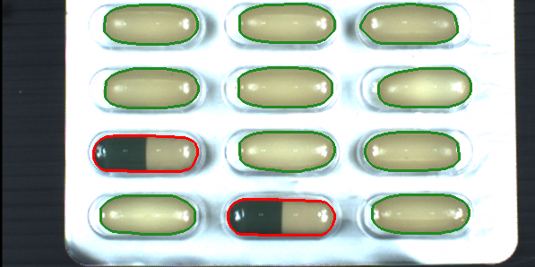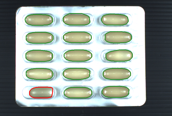 *这个例子主要演示了医药行业的应用,主要是检测自动填充胶囊是否正确。第一张图片主要是作为参考模型,用于定位胶囊的位置。使用blob分析法去判断整个胶囊的状态。