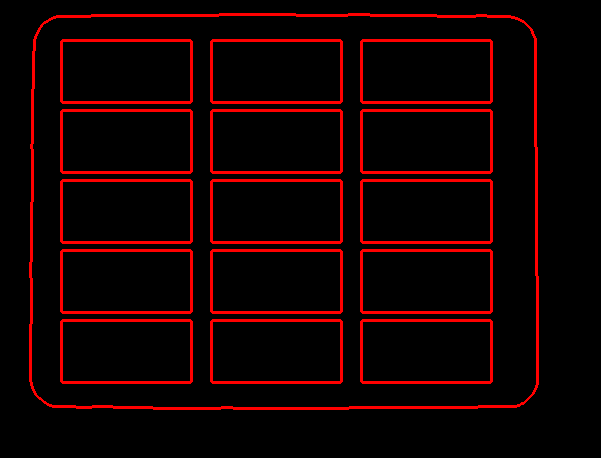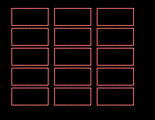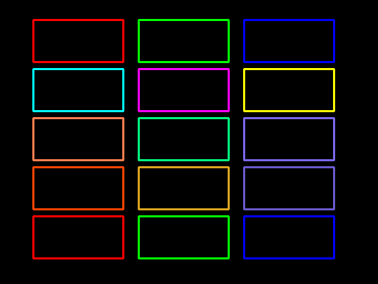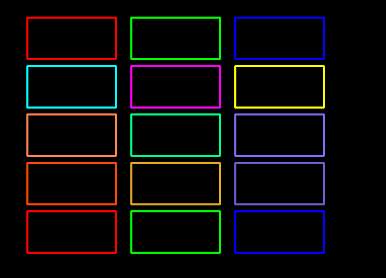 for I := 0 to 4 by 1 Row := 88 + I * 70 for J := 0 to 2 by 1 Column := 163 + J * 150 gen_rectangle2 (Rectangle, Row, Column, 0, 64, 30) concat_obj (Chambers, Rectangle, Chambers) endfor endfor