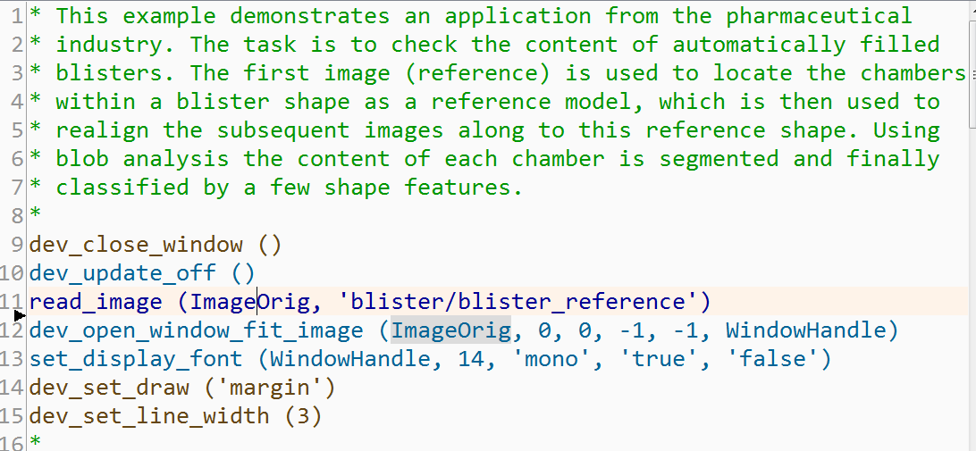 read_image (Image, 'blister/blister_' + Index$'02') threshold (Image, Region, 90, 255) connection (Region, ConnectedRegions) select_shape (ConnectedRegions, SelectedRegions, 'area', 'and', 5000, 9999999) shape_trans (SelectedRegions, RegionTrans, 'convex')