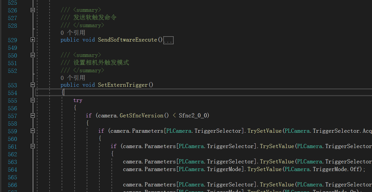 /// /// 设置相机外触发模式 /// public void SetExternTrigger() { try { if (camera.GetSfncVersion() < Sfnc2_0_0) { if (camera.Parameters[PLCamera.TriggerSelector].TrySetValue(PLCamera.TriggerSelector.AcquisitionStart)) { if (camera.Parameters[PLCamera.TriggerSelector].TrySetValue(PLCamera.TriggerSelector.FrameStart)) { camera.Parameters[PL
