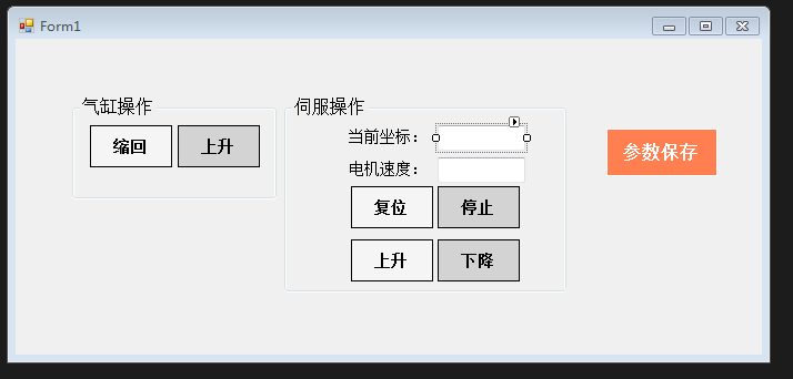 伺服一般我们必须配置回零按钮,停止按钮,上升或前进按钮,下降或后退按钮,这四个按钮是必须要有的,然后就是实时读取当前坐标,我们在位置控制的时候,看到实时坐标,就很容易设置坐标。然后就是设置一个电机速度和电机坐标,这两个是一样的,所以我就放置了一个速度;