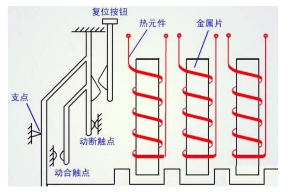 5、当红色线中有交流电通过时,由于电磁感应原理,(在交流电流中,金属片切割磁感应线,产生热量),产生热量,当电流过大时,热量增加,热量达到金属片发生较大形变后,会推动连杆动作,使控制电路断开,从而实现保护电动机的过载保护;