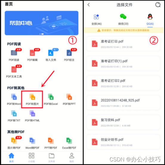 ① 首先,我们在手机上打开软件,可以看到页面中有很多功能,找到并点击【PDF转图片】,进入后就可以选择需要转换的PDF文件了。