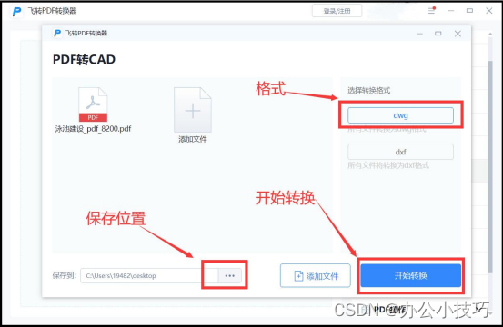 ② 文件添加进来后,我们选择一下转换格式,然后把转换后文件的保存位置设置一下,点击【开始转换】,文件就会转换成CAD文件啦。