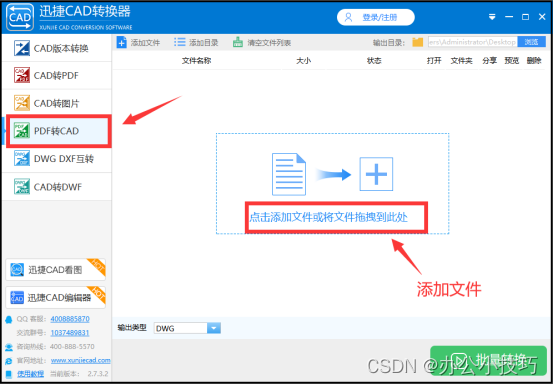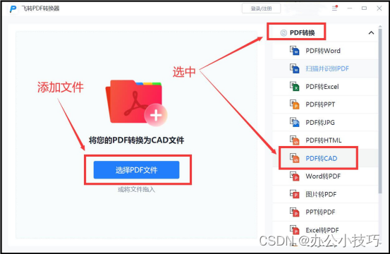 ① 首先,我们在页面中很容易就能看到【PDF转CAD】选项,选择后把文件添加进来。