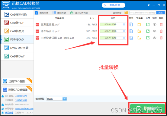③ 最后,我们点击页面下方的【批量转换】,看转换状态值就可以知道文件的转换进度啦,状态值满了就转换成功了。