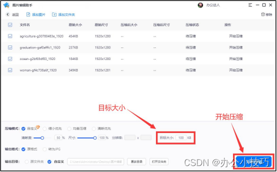 ③ 最后,我们在下方输入目标大小,点击【开始压缩】,我们的图片就会压缩成功啦。