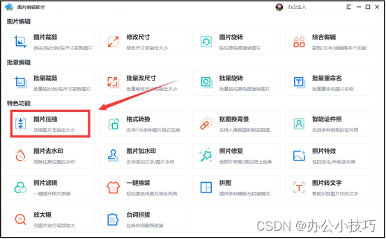 ① 首先,我们进入到操作页面中,在众多功能中选择【图片压缩】。
